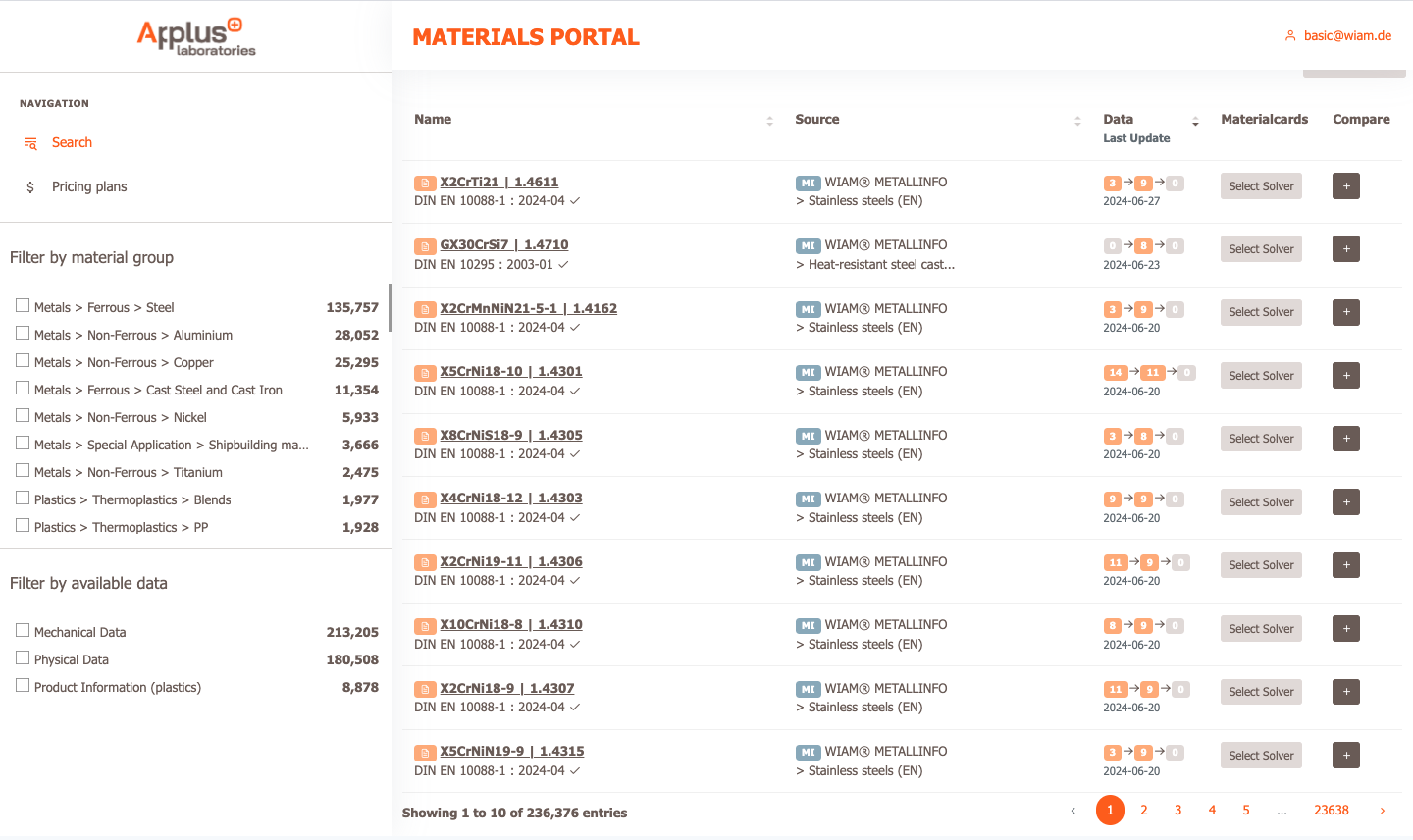 Multi-source materials data from multiple libraries, e.g. European and International materials standards, supplier information and public testing for a broad range of engineering applications in materials and product development.